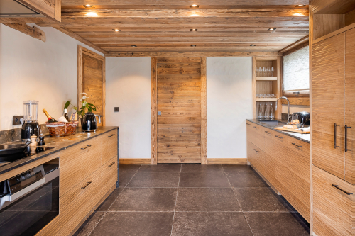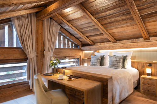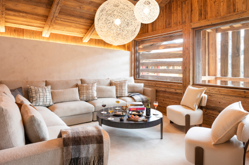 Chalet de 550 m² sur trois niveaux comprend 5 chambres doubles, un dortoir de deux lits simples et un dortoir de quatre lits simples, un grand espace de vie comprenant un salon avec cheminée, salle à manger, cuisine fermée équipée, salle de cinéma et balcon en bois avec vue sur la chaine du Mont-Blanc. Les voyageurs ont également accès à un espace détente au rez-de-chaussée constitué d'un Jacuzzi, sauna, hammam et salle de fitness.