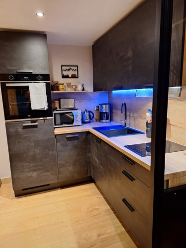 Cuisine équipée , frigo avec petit congélateur intégré, lave vaisselle, appareil à raclette, appareil à fondue, grille pain, four micro onde ,bouilloire et machine à café Nespresso ainsi qu’une cafetière à filtre.